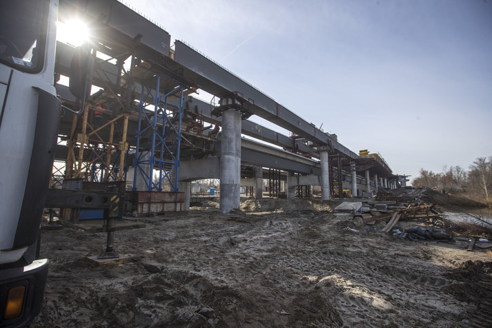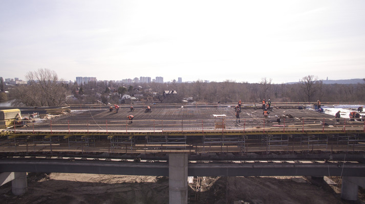 «Як ви бачите, ми суттєво просунулися в напрямку Троєщини. Кілька тижнів тому фахівці встановили 70-тонні балки нової частини мостового переходу через Русанівське озеро. Робили це за допомогою сучасних надпотужних домкратів, що вже показали свою ефективність на будівництві Шулявського шляхопроводу. Також розпочали встановлення на цих балках бетонних плит та їх укріплення. Нам залишилося ще метрів 200 і ми вийдемо на роботи з будівництва з’їздів. До речі, вже триває облаштування насипу там, де буде з’їзд з мосту на Лівому березі», - наголосив Кличко.