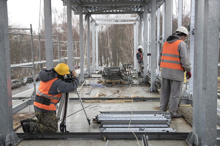 Він повідомив, що сьогодні тривають активні роботи на пішохідному мосту біля кінотеатру «Лейпциг» - там вже встановили основну частину конструкції і монтують дах. Готові й опори для встановлення шахт ліфтів, що працюватимуть з обох сторін мосту.