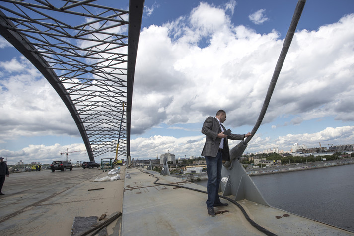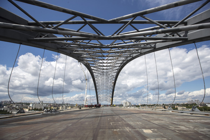 «Вже встановили 8 великих тросів. Їх, нагадаю, місто придбало у німецької компанії Bridon-Bekaert - відомого в світі підприємства, що виробляє всі види промислових сталевих тросів, - сказав Кличко. - Зазначу, що Подільсько-Воскресенський - найбільший арочний міст в Європі. На ньому облаштують 6 смуг для автомобільного руху та 2 залізничних колії під майбутнє метро - на нижньому ярусі. Прокладуть також і трубопровід».