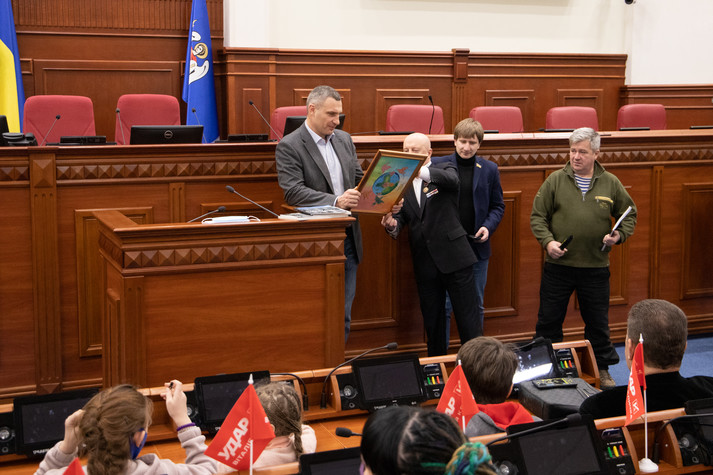 Школярі подарували Віталію Кличку картину, а також відстріляну гільзу, розписану українським орнаментом.