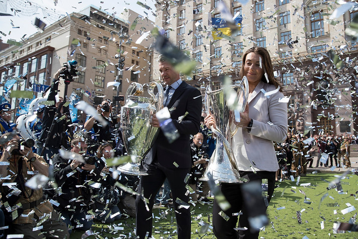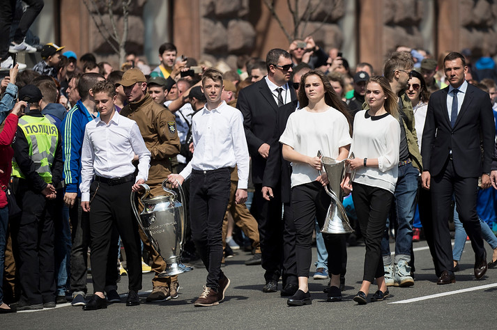 Київ урочисто зустрів кубки Ліги чемпіонів УЄФА, які отримають переможці жіночого та чоловічого фіналів. Урочистості відбулися на Хрещатику, біля Київської міської державної адміністрації.