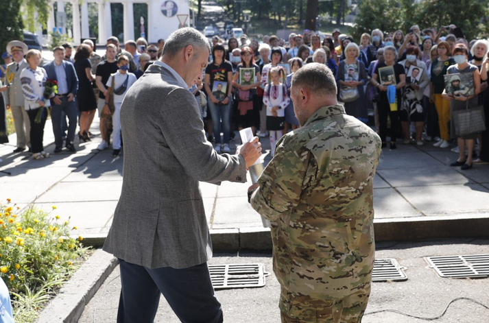 Церемонія відбулася біля приміщення Національної бібліотеки України імені Ярослава Мудрого на вулиці Михайла Грушевського. Участь в ній взяли також родини загиблих військовослужбовців та добровольців.