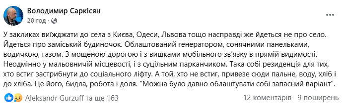 Володимир Саркісян зауважив, що поради «їхати в село» часто звучать від людей, які мають не просто хату, а облаштований заміський будинок. Це створює ілюзію вибору, якої позбавлені мільйони інших.