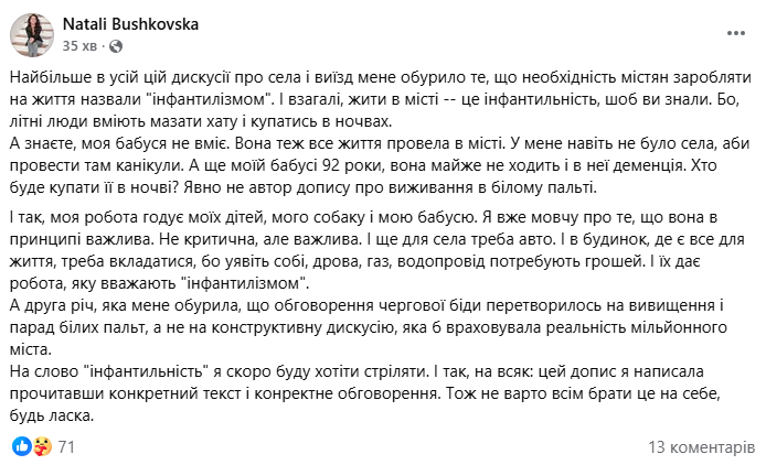 Найгострішою стала дискусія навколо звинувачень містян у «інфантилізмі». Natali Bushkovska обурилася тим, що звичайне життя в квартирі та залежність від роботи прирівнюють до несамостійності.