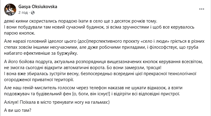 Частина киян, яка вже перебралася в села, ділиться досвідом «технологічного виживання». Користувачка Gasya Oksiukovska іронічно описує, як сучасні будинки з «кнопками» пасують перед морозом.
