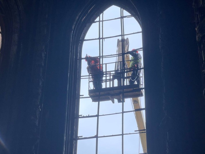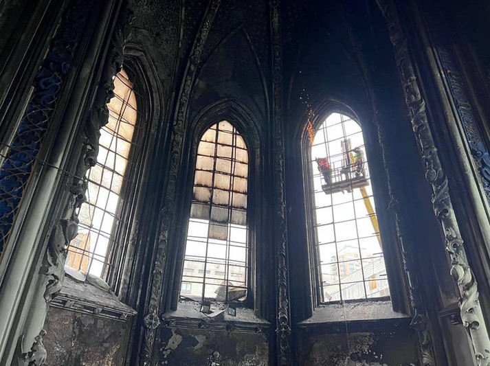 Наразі триває монтаж захисних конструкцій вікон, що постраждали від високих температур. Також фахівці готуються до очищення внутрішніх поверхонь та встановлюють риштування.