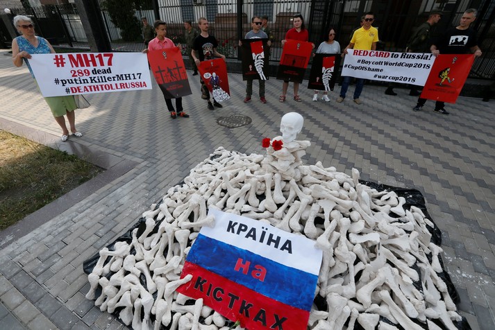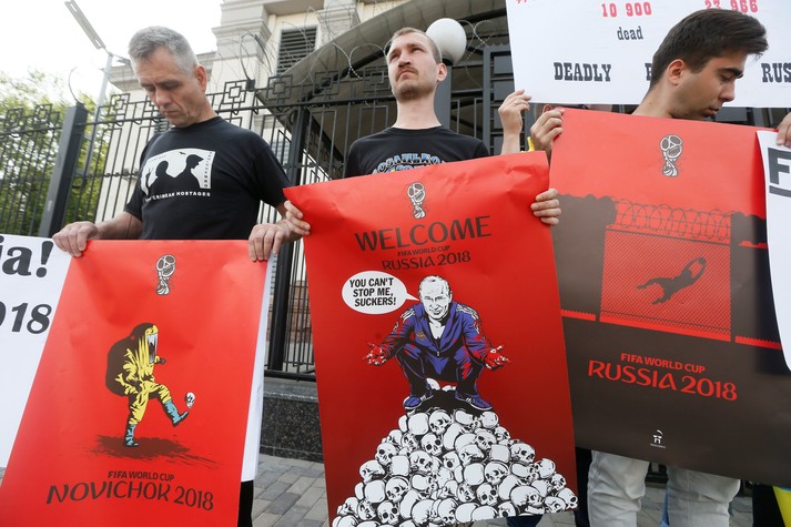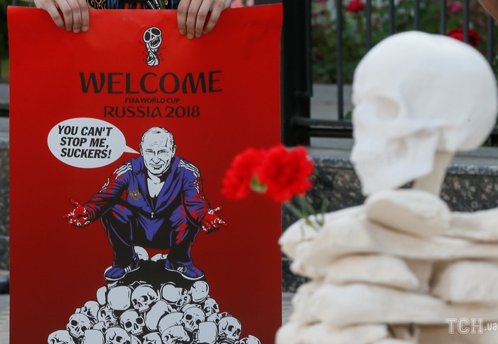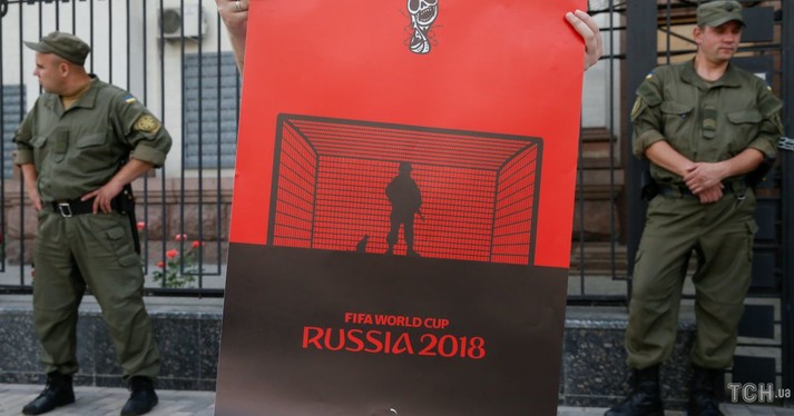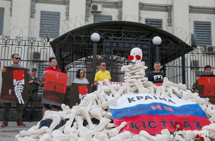 Сьогодні, 14 червня, у Києві біля посольства Російської Федерації влаштували акцію із закликом бойкотувати Чемпіонат світу з футболу, який відбувається у РФ.