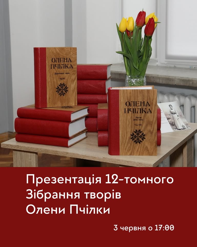 Запрошуємо на презентацію першого в історії багатотомного Зібрання творів Олени Пчілки. Зібрання творів у 12 томах представляє багатогранну творчу спадщину Олени Пчілки, це – поезія, проза, драматургія, літературна критика, публіцистика, фольклористика, етнографія, художні переклади. Виняткову цінність мають її мемуаристика й епістолярій. До видання увійшло близько 80% тих текстів авторки, які були опубліковані лише раз за її життя або взагалі залишилися в рукописі. Отже введенняв обіг великого масиву мало відомих і невідомих текстів письменниці дає можливість відсторонитись від стійких совєтських канонів і скласти правдивий портрет Олени Пчілки в контексті її доби. Усі тексти подано за автографами або першодруками; збережено особливості авторської мови й стилю.