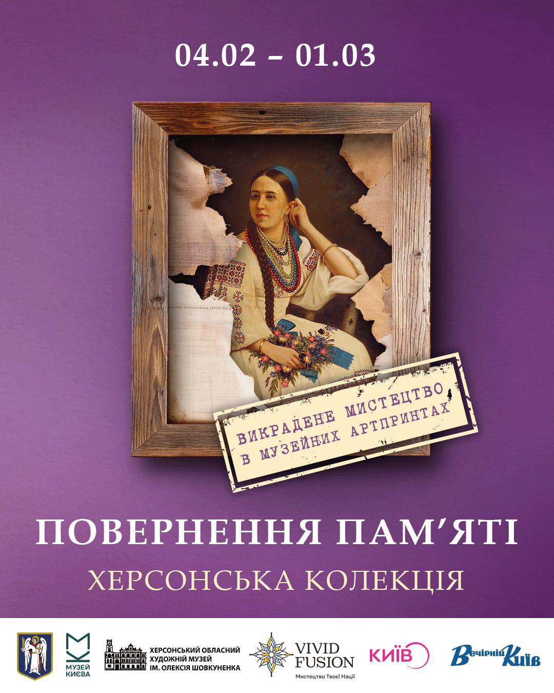 4 лютого у Музеї історії міста Києва розпочинається спільний виставковий проєкт із Херсонським художнім музеєм та Vivid Fusion Art Під час окупації з Херсонського обласного художнього музею було викрадено чимало художніх творів – живопис, графіку, ікони, предмети декоративного мистецтва. Виставка публічно фіксує цю втрату й повертає колекцію до візуальної пам’яті у форматі музейних артпринтів, створених на основі збережених цифрових копій, архівних фото та інвентарних описів.