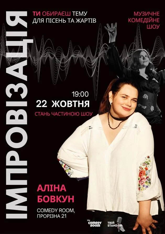 Новий формат стендапу, якого ти ще не бачив і точно будеш здивований. Аліна Бовкун створює пісні просто з історій глядачів – тут і зараз. Ти задаєш обставини для гри, твої фрази, навіть твоя крінжова історія можуть стати хітом вечора. Без сценарію. Без репетицій. Але, звісно, з купою сміху та драйву.