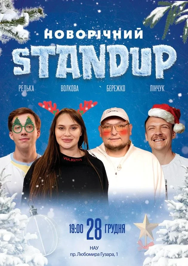 У неділю ввечері відбудеться новорічний стендап. Гарним настроєм глядачів заряджатимуть: Фелікс Редька, Алла Волкова, Андрій Бережко, Павло Пінчук.