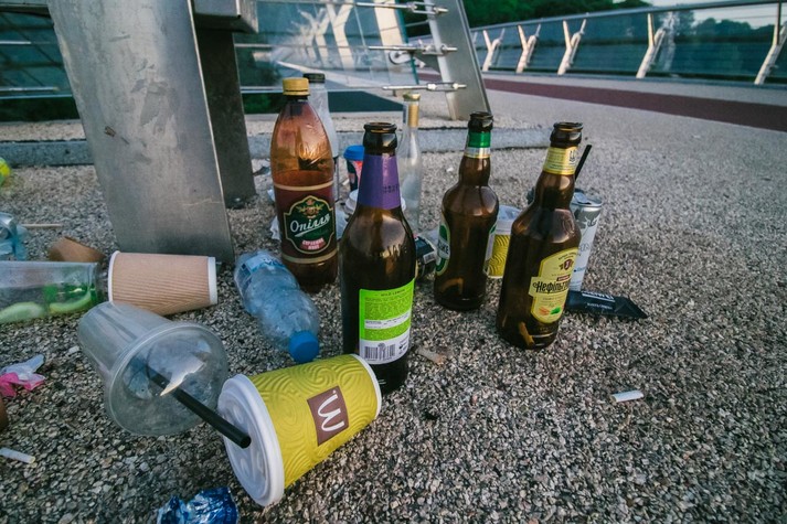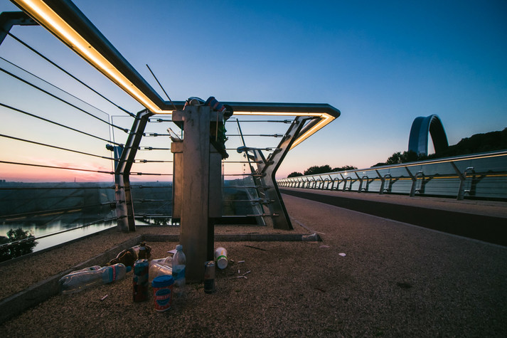 На нещодавно відкритому пішохідно-велосипедному мосту, що з’єднав парк «Володимирська гірка» та Арку дружби народів у Києві і на якому вже сиплеться скляна підлога, відвідувачі залишають гори сміття.