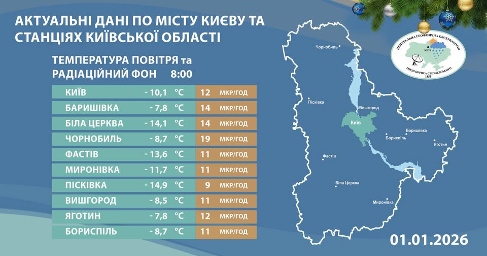 За даними Центральної геофізичної обсерваторії імені Бориса Срезневського, ранок 1 січня 2026 року на Київщині видався доволі холодним. Станом на 8:00 температурні показники в області суттєво відрізняються, проте всюди тримається впевнений «мінус». Про це повідомляє «Главком» із посиланням на дані обсерваторії.