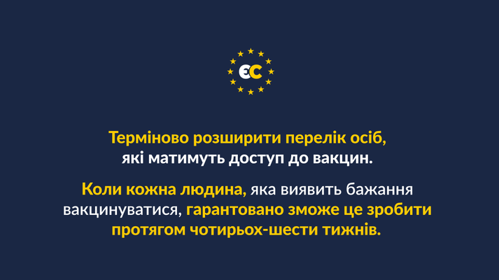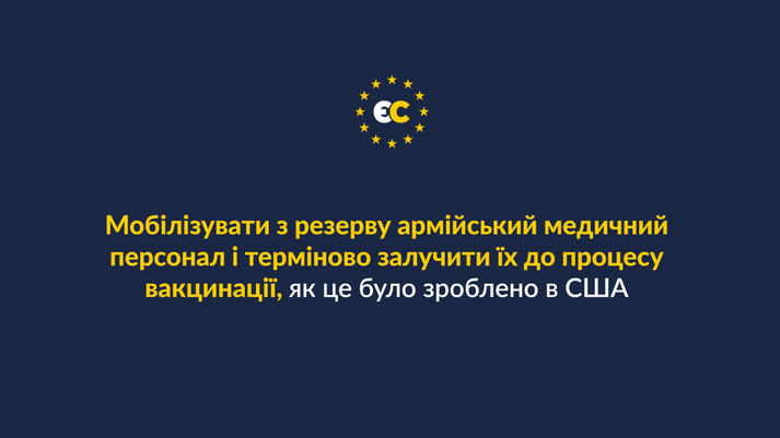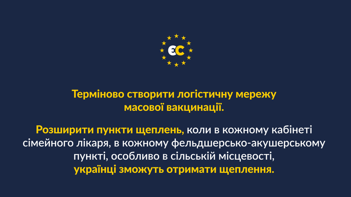 «ЄС» закликає терміново створити логістичну мережу масової вакцинації. Розширити пункти щеплень, коли в кожному кабінеті сімейного лікаря, в кожному фельдшерсько-акушерському пункті, особливо в сільській місцевості, українці зможуть отримати щеплення. Необхідно мобілізувати з резерву армійський медичний персонал і терміново залучити його до процесу вакцинації, як це було зроблено в США.