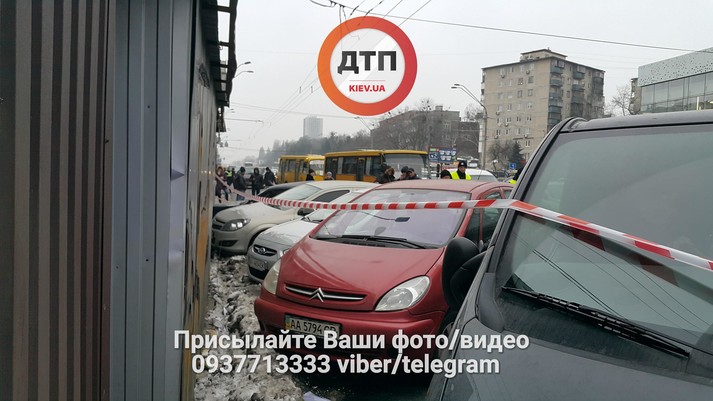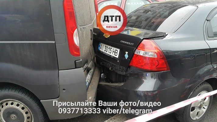 Водій автомобіля Chevrolet рухався в крайньому лівому ряду. На слизькій дорозі машину занесло і лівим боком вона врізалася у відбійник. Від удару Chevrolet відкинуло вправо в припарковані в смузі громадського транспорту біля магазинів автомобілі. В результаті пошкоджено 5 машини: Daewoo, Hyundai, Opel, Citroen і Opel.