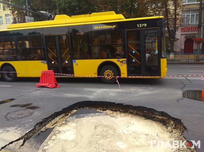 Прорив труби і масштабний провал на проїжджій частині утворився сьогодні вранці прямо біля зупинки громадського транспорту на площі Слави (Печерський район) у Києві. Про це повідомляє кореспондент «Главкома».