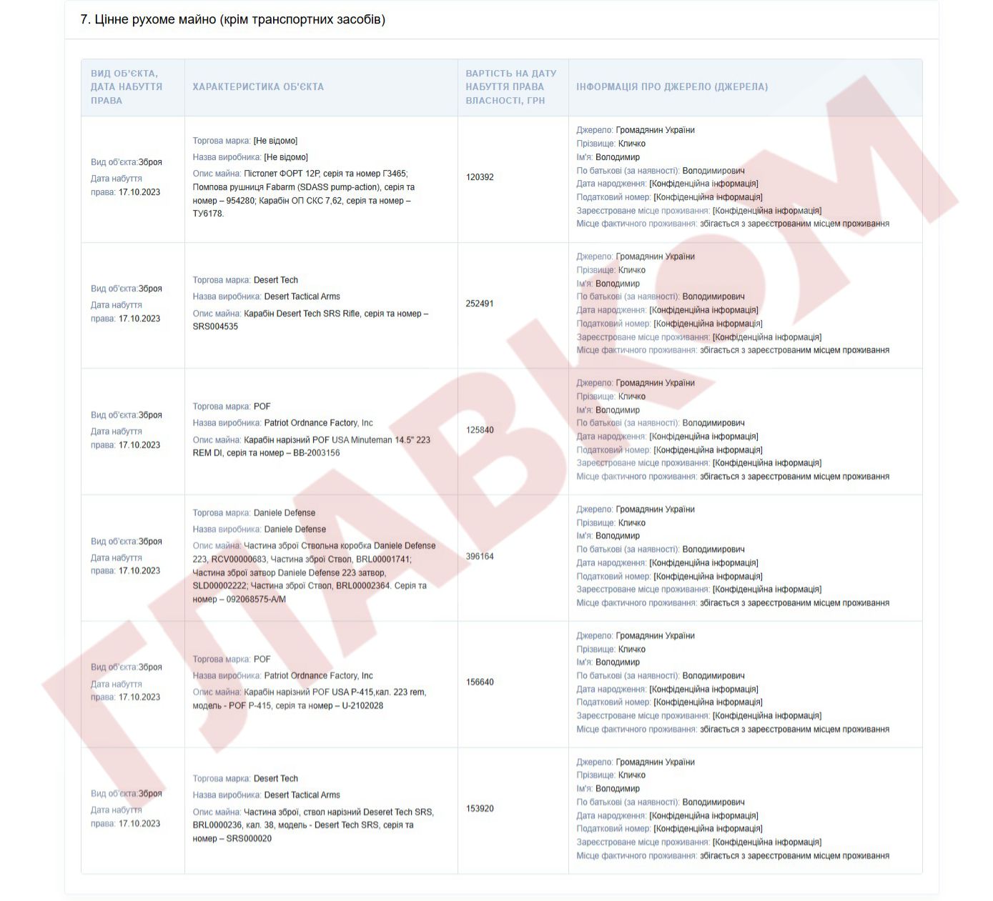 - пістолет «Форт» 12Р, помпова рушниця Fabarm (SDASS pump-action) і карабін ОП СКС 7,62 загальною вартістю 120,39 тис. грн;