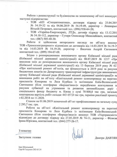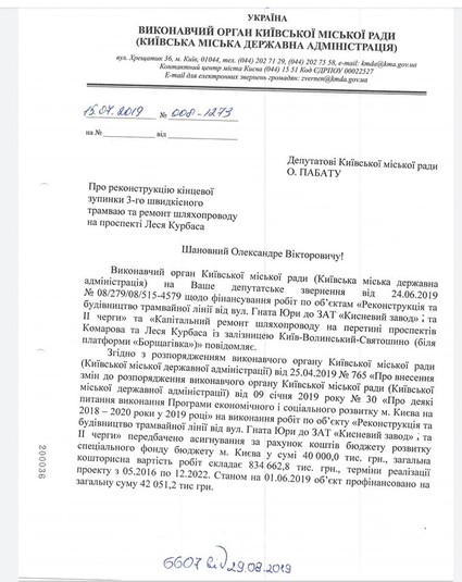«Реконструкція та будівництво трамвайної лінії від вулиці Гната Юри до ЗАТ «Кисневий завод» І та ІІ черги триватиме до грудня 2022 року. Що стосується виконання робіт на об'єктах «Капітальний ремонт шляхопроводу на перетині проспектів Комарова і Леся Курбаса із залізницею Київ-Волинський-Святошино (біля платформи «Борщагівка»), то і тут термін реалізації проекту триватиме до листопада 2020 року. І все це разом буде реконструкцією вже проведеного ремонту», - переповів Пабат текст відповіді Давтяна.