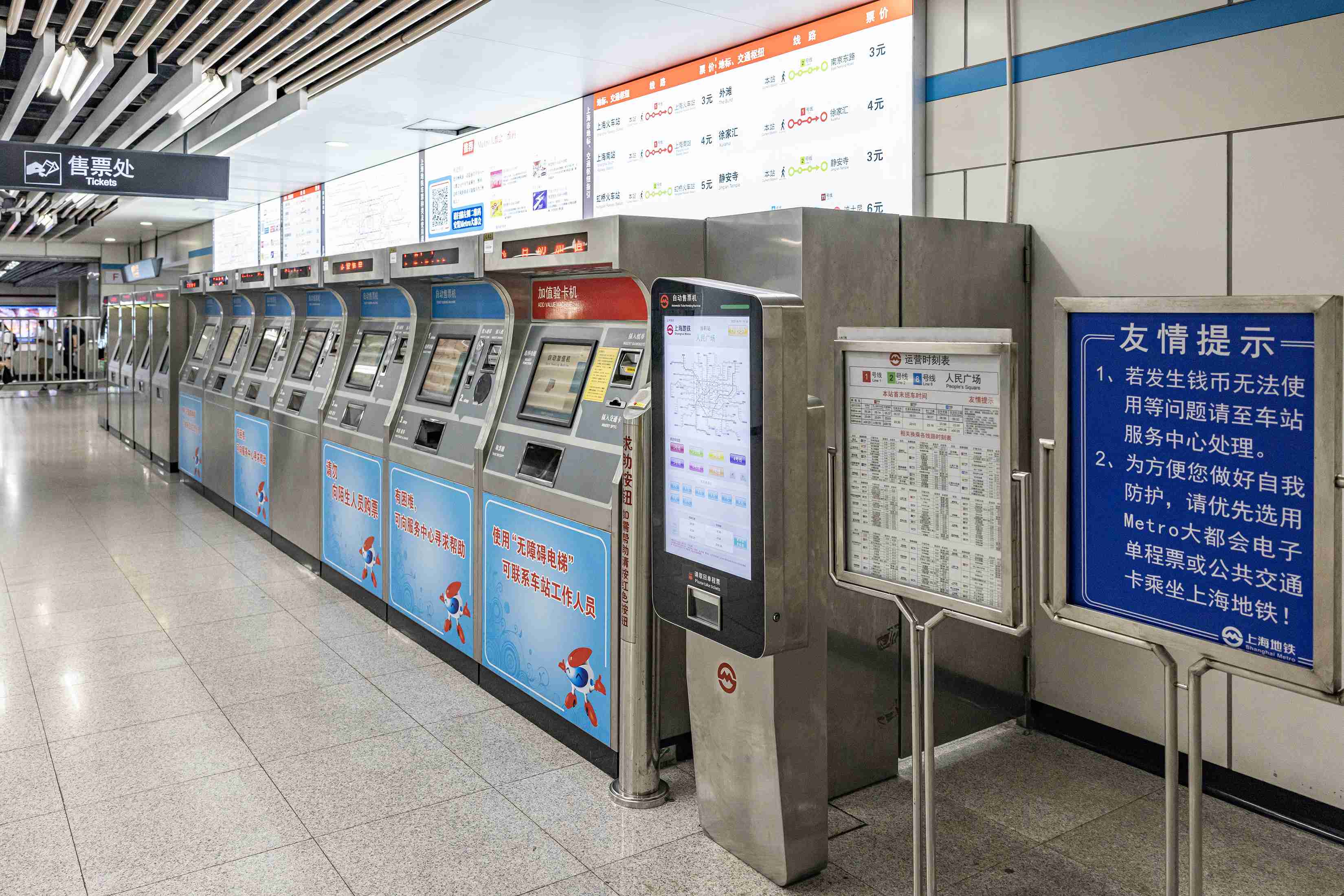 У шанхайському метро паперові квитки поступилися місцем пластику та цифровим кодам. Навіть разовий проїзд тут оплачується за допомогою спеціальної картки, яку пасажир купує в англомовному автоматі. Туристи зазвичай обирають безлімітні проїзні на 24 або 72 години або купують універсальну транспортну карту із заставною вартістю у 20 юанів, яку на виході потрібно обов'язково повернути системі, опустивши її у спеціальний отвір турнікета.