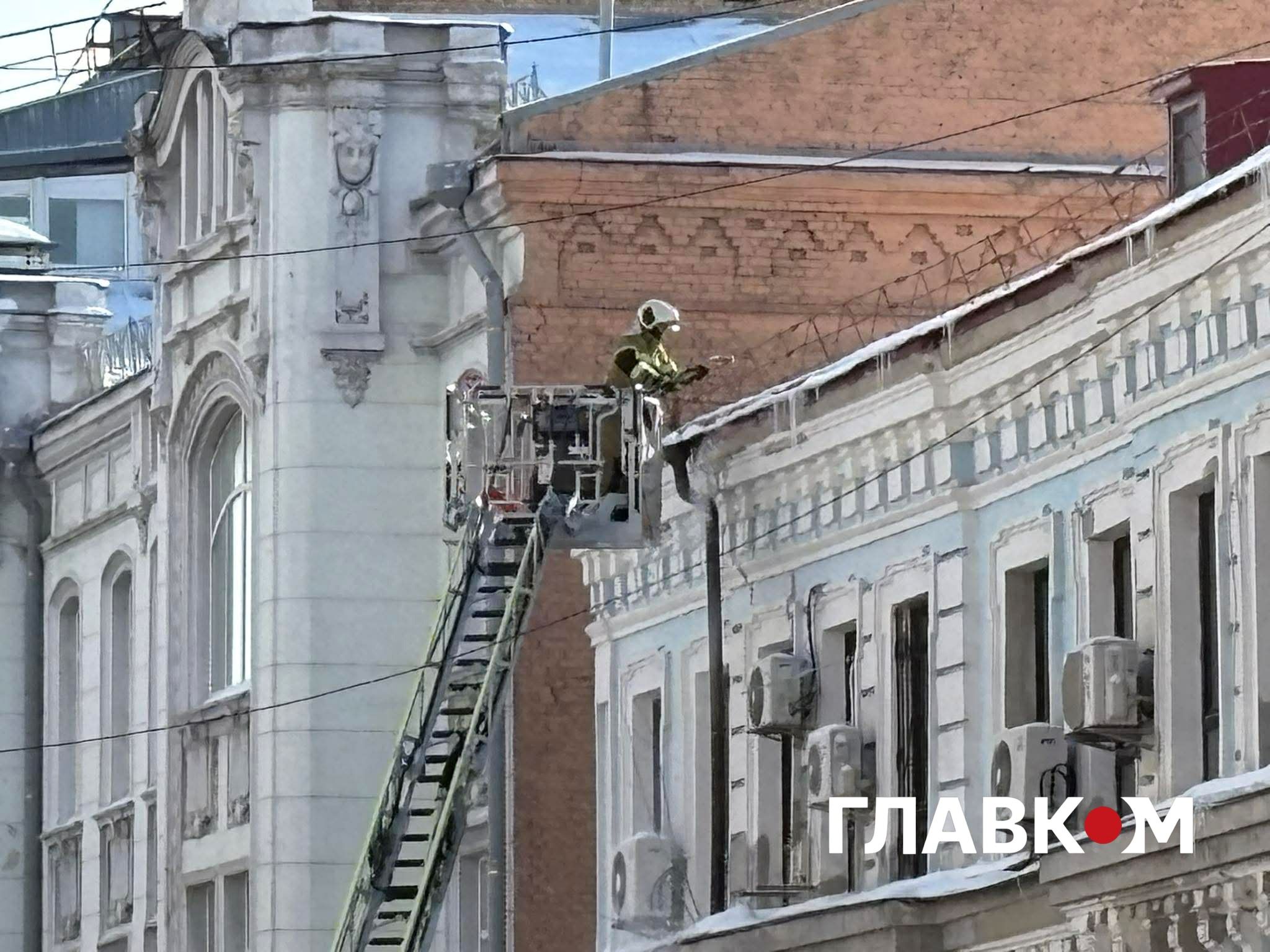 Рятувальник, стоячи у люльці автодрабини, лідорубом збивав бурульки та знімав брили снігу з даху будівлі на Прорізній. Прилеглу до адміністративної будівлі пішохідну зону на час робіт огородили сигнальною стрічкою.