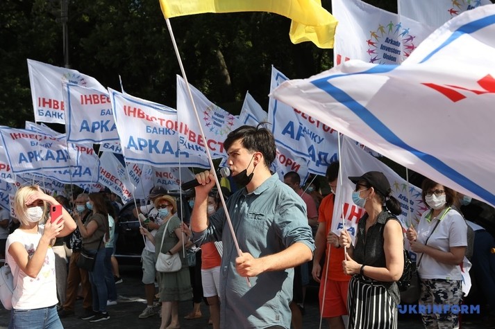 Водночас ще близько сотні мітингувальників прийшли під Кабінет міністрів із прапорами «Інвестори банку «Аркада», а також із прапорами України. Вони тримають у руках плакати: «Досить чекати! Треба будувати!», «Інвестори вимагають свої квартири», «Вимагаємо кредит 3,6 млрд грн», «Вимагаємо: добудова за 3 роки».