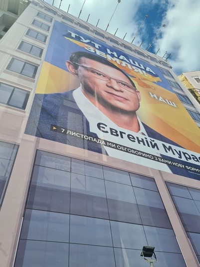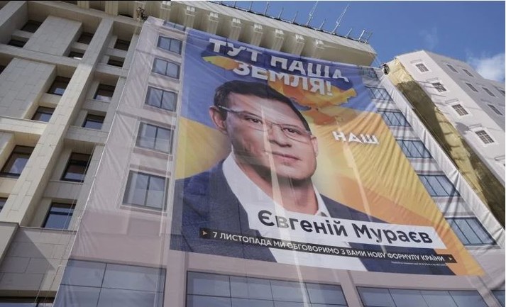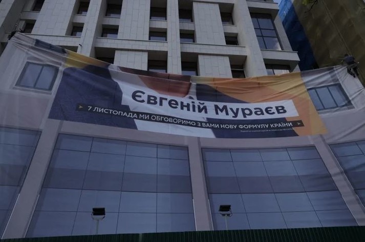 Нагадаємо, сьогодні активіст Сергій Стерненко повідомив, що у Києві на Будинку профспілок вивісили банер із зображенням Євгена Мураєва. На ньому напис був напис: «Тут наша земля». Також виднівся логотип телеканалу «Наш», який опосередковано належить Мураєву.