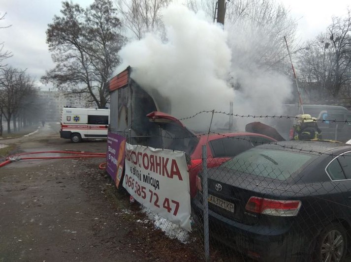 У Святошинському районі столиці сталася пожежа на автостоянці. Згорів автомобіль, залишений на стоянці, а охоронець отримав опіки. Про це повідомляє пресслужба ДСНС.