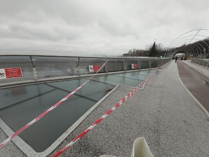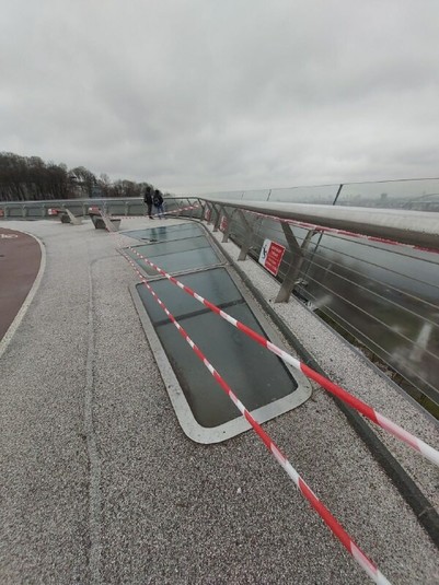 В середині жовтня на пішохідно-велосипедному мосту в Києві розбилося ще одне скло. Цього разу постраждала секція скла, що закриває освітлення на перилах шляхопроводу.