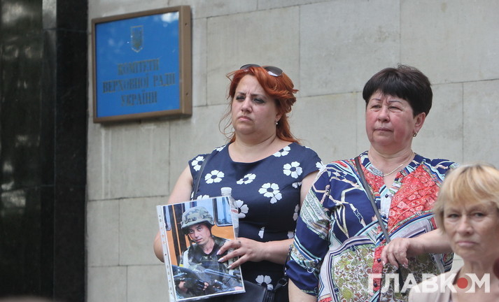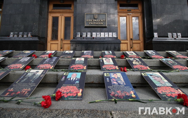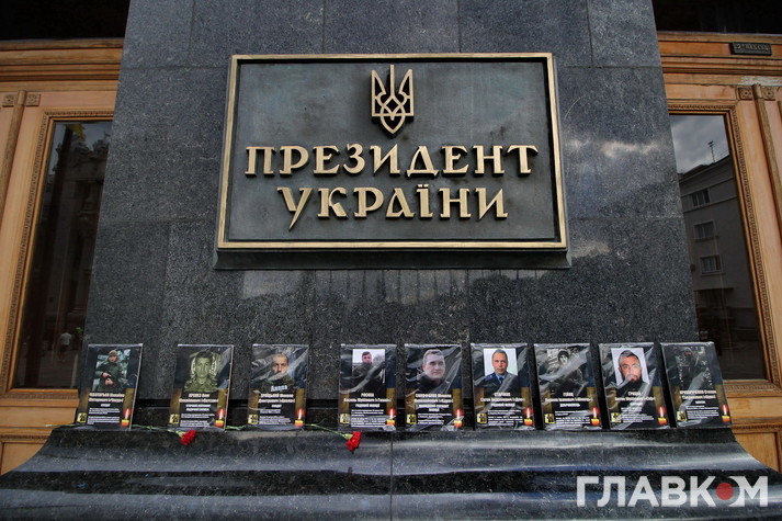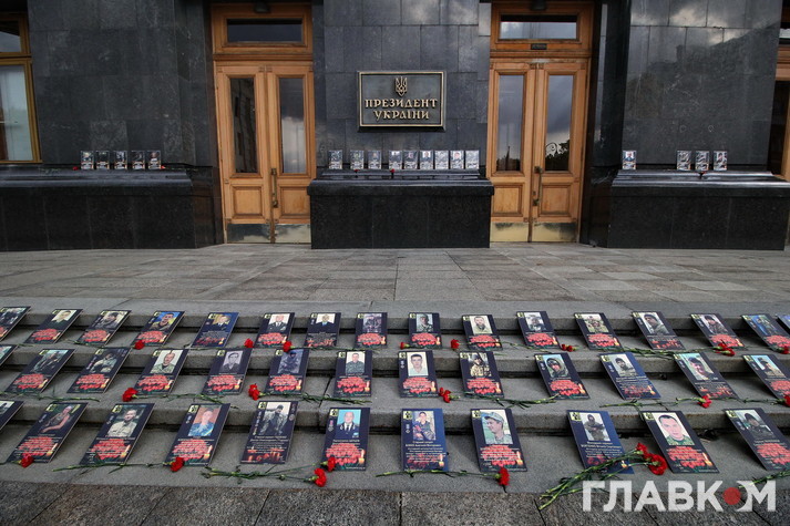 Учасники акції розмістили на сходах біля входу в АП фото своїх загиблих на війні на Донбасі рідних та поклали квіти. Також портрети своїх чоловіків жінки тримають в руках.