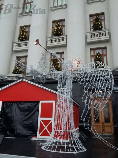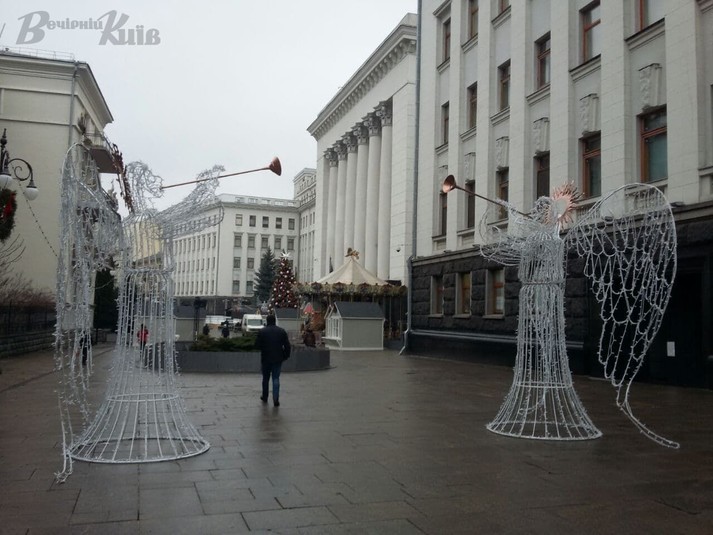 Так, перед вікнами Офісу президента з’явилися фігури різдвяних ангелів, які будуть світитися ввечері. У вікнах будівлі вистановлені ялиночки, а на ліхтарях розвісили різдвяні віночки.