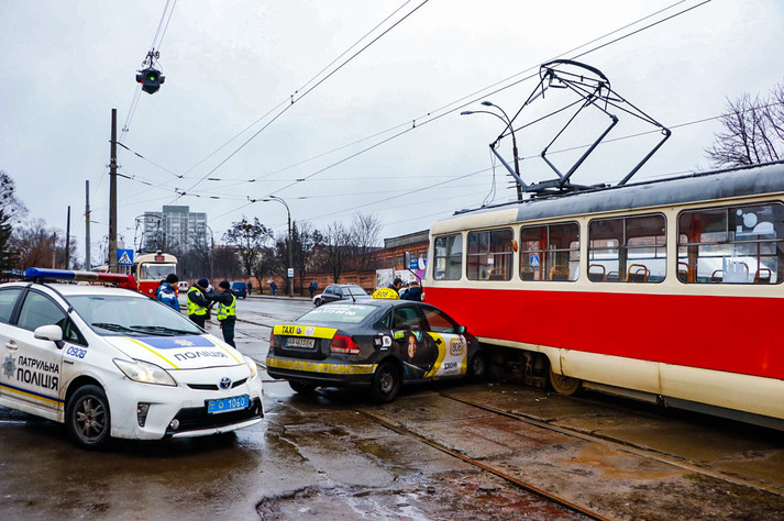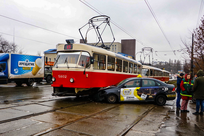 У п’ятницю, 27 грудня, на вулиці Миколи Василенка у Києві сталася ДТП, що призвела до транспортного колапсу. Volkswagen служби таксі не помітив трамвай і протаранив вагон, зупинивши рух відразу декількох маршрутів.