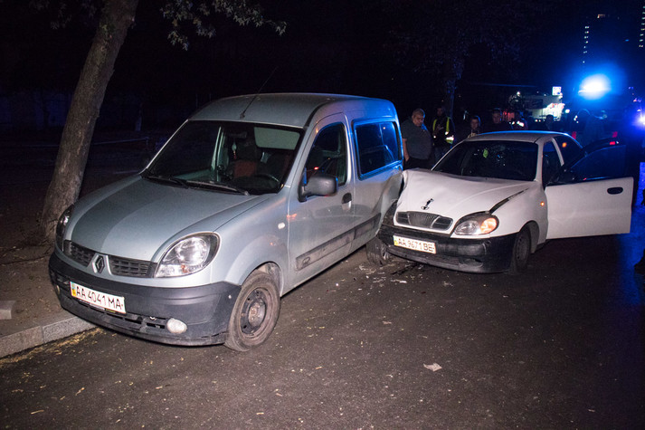 У ніч на 11 травня на проспекті Павла Тичини, 5 у Дніпровському районі Києва сталася ДТП: таксист на Daewoo Lanos врізався у припаркований Renault Kangoo.