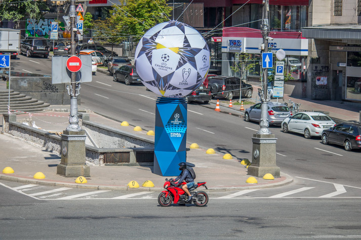 Вранці у середу, 23 травня, у Києві біля Бессарабської площі здувся один з м'ячів, встановлених до фіналу Ліги чемпіонів. Надувна конструкція повисла на стропах.