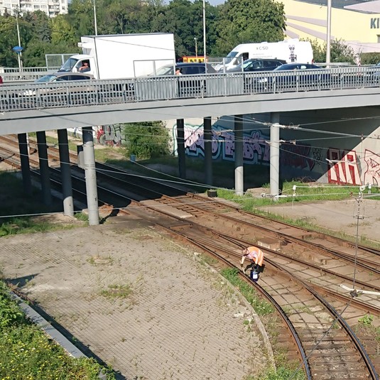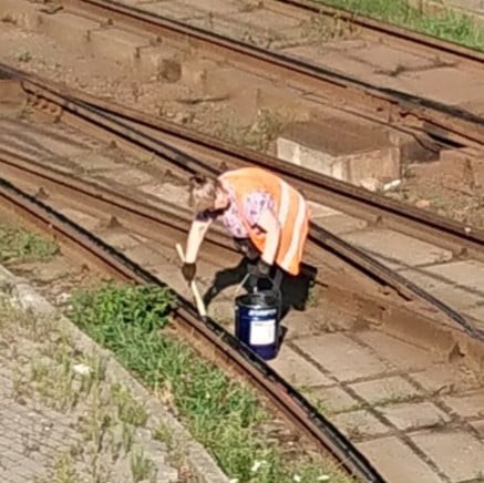 «…Знайшлося високотехнологічне рішення – супернаносмазка, і о диво ... трамвая майже не чути», – жартують у дописі до фото, на якому зафіксовано, як працівниця «Київпастрансу» вручну змащує рейки якимось мастилом.