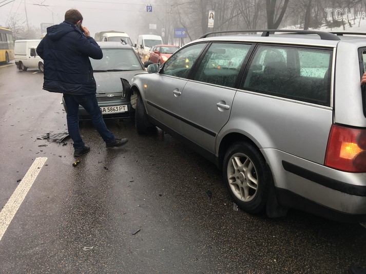 Спочатку зіткнулись дві машини. Інша автівка намагалась об'їхати аварію, однак в неї ззаду врізалась ще одна машина. Від удару першу відкинуло на зустрічну смугу і вже за ланцюговою реакцію загалом у ДТП були задіяні сім транспортних засобів, повідомляє ТСН.
