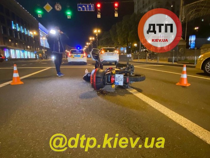 У четвер, 20 травня, ввечері на Хрещатику сталася дорожньо-транспортна пригода. Аварія за участю мотоцикліста та автомобіля трапилася навпроти ЦУМа. Про це повідомляє dtp.kiev.ua.