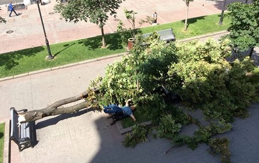 «Дерево впало прямо на голови перехожим ледве встигли відскочити. З вікна навпроти за всім цим спостерігав мер Києва Віталій Кличко, зараз почне вживати заходів. Добре, що ранок та на лавочках, зазвичай заповнених, нікого немає ...», - жартує у себе на сторінці в Фейсбук Тарас Ламах.