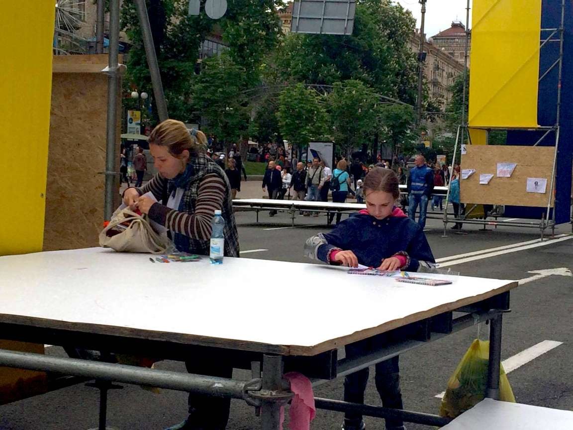 Сьогодні на головній вулиці столиці Хрещатику зранку відбувається акція до Дня пам’яті та примирення. Усі бажаючі, зокрема діти, малювали на аркушах паперу їхнє бачення миру в Україні та прикріпити їх на дошки.