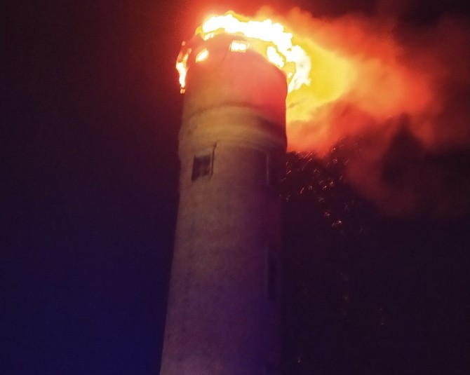 По прибуттю рятувальниками встановлено, що виникло загорання перекриття башти.