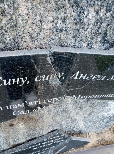 У ніч на вівторок, 2 червня, у Миронівці Київської області скоєно акт вандалізму. Невідомий розбив пам'ятну дошку, яку встановлено на честь матерів загиблих воїнів АТО. Про це повідомляє Миронівська міська рада на своїй сторінці у Facebook.