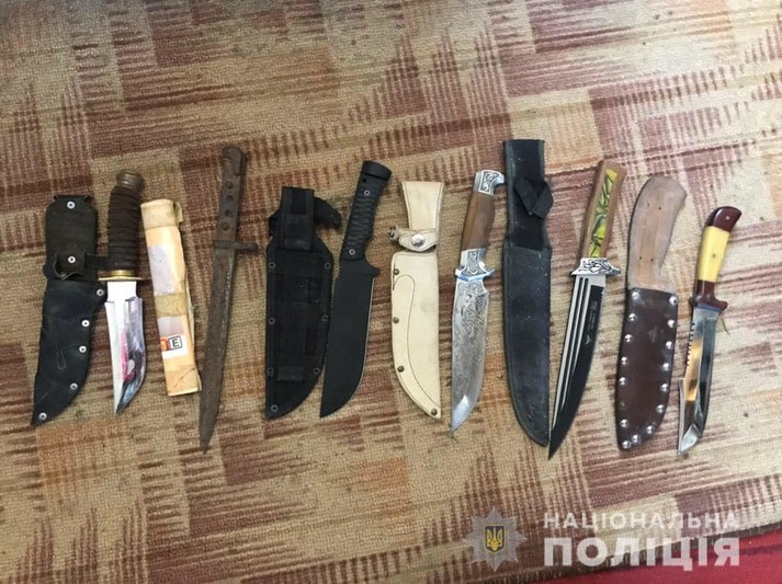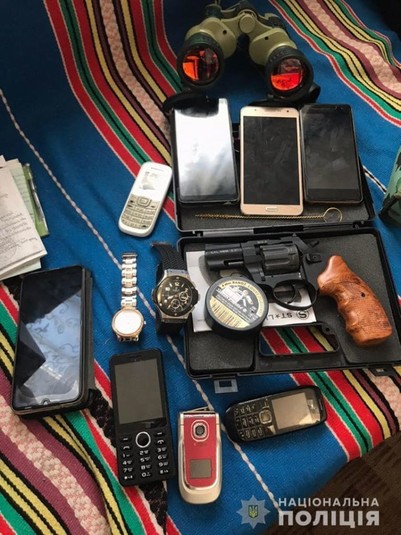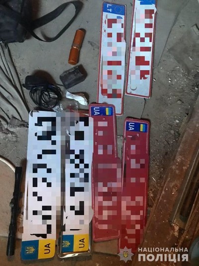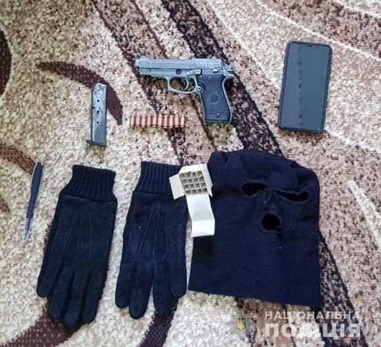 Під час проведення обшуків за місцем мешкання нападників працівники поліції виявили та вилучили вогнепальну незареєстровану зброю, набої, ножі, маски, перуки, радіостанції, біноклі, інші знаряддя вчинення злочинів та речові докази, різні номерні автомобільні знаки.
