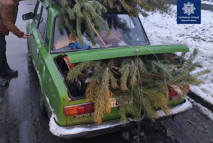На Київщині патрульні затримали «копійку», набиту незаконно вирубаними ялинками (фото)