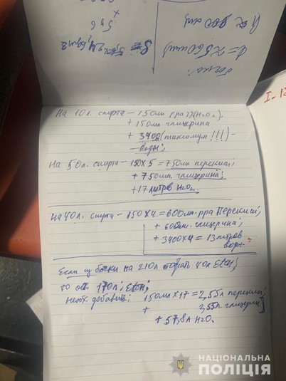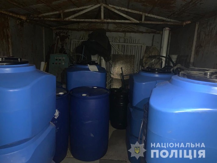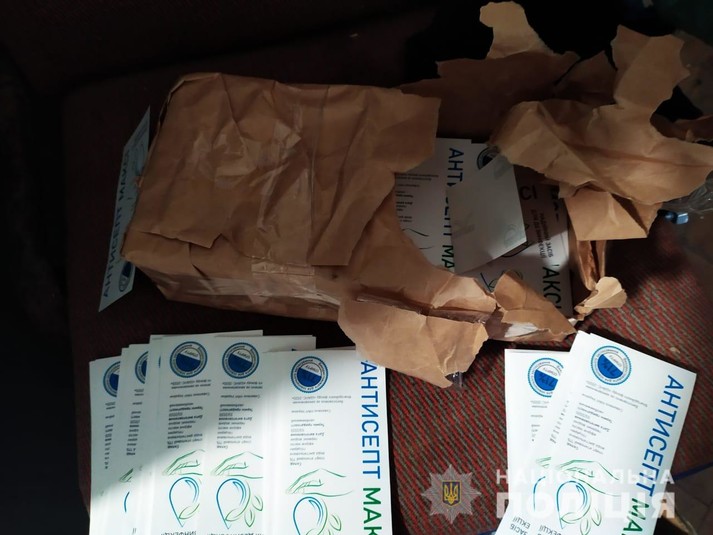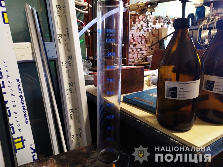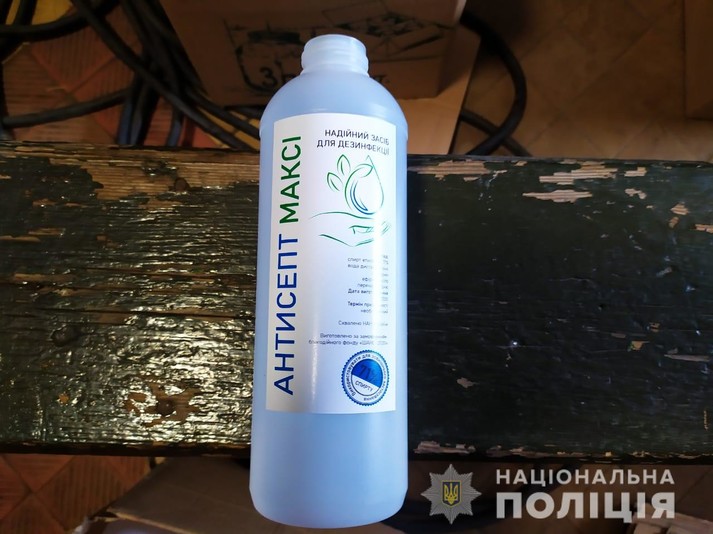 Оглянувши приміщення колишнього будинку культури, правоохоронці помітили в одній із кімнат лабораторію. На місце події прибула слідчо-оперативна група. Під час проведення невідкладного обшуку поліцейські виявили пластикові цистерни з різними рідинами, обладнання для виготовлення дезінфікуючого засобу, різні ємкості та етикетки на розфасовану «готову» продукцію.