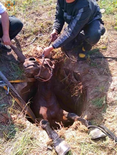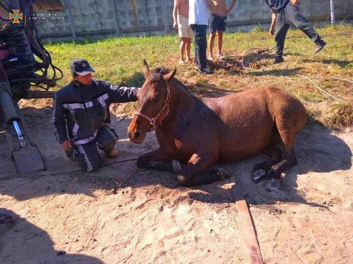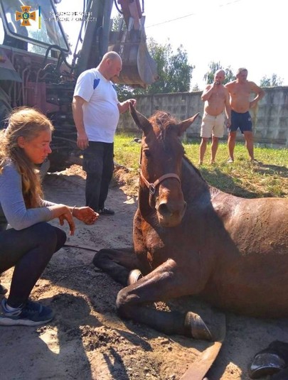 По прибуттю, рятувальники спустилися у колектор, обв’язали коня поясками та мотузками та за допомогою гідравлічного приводу трактора витягнули на поверхню.