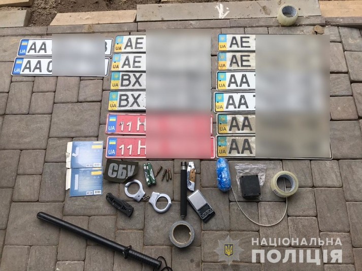 Під час проведення обшуків за місцем проживання зловмисників виявлено та вилучено 9 пістолетів різної модифікації, набої, поліцейський однострій та жетони, різні посвідчення, серед яких працівників поліції та СБУ, Адміністрації президента України, податкової служби, шеврони з написами «СБУ», «Поліція», кайданки, кийки, мобільні телефони, понад 35 тисяч доларів США та 500 євро, банківські картки, велику кількість наркотиків, таких як амфетамін, метадон, героїн.