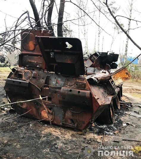 Після звільнення Київщини від російської окупації під час відпрацювання місцевості правоохоронці знайшли два автомобілі російських окупантів: КаМАаз та «Урал», а також бойову машину піхоти БМП-2 і танк Т-72. Техніка агресора наразі поповнила автопарк Збройних сил України. Про це повідомляє пресслужб Нацполіції України.