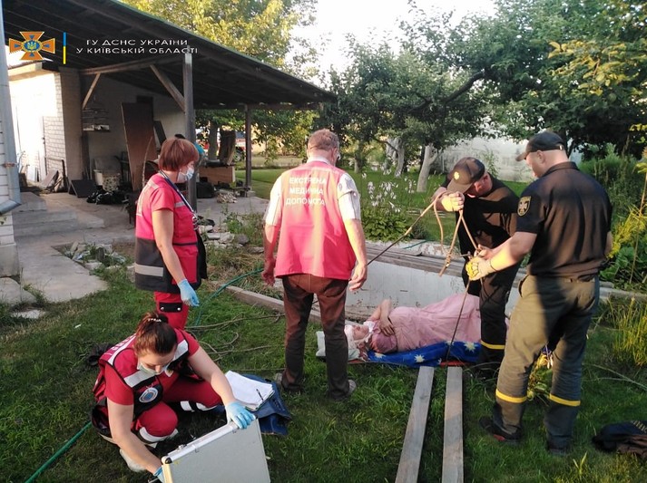 За допомогою рятувальної мотузки жінку підняли з басейну та передали медикам у карету швидкої допомоги.