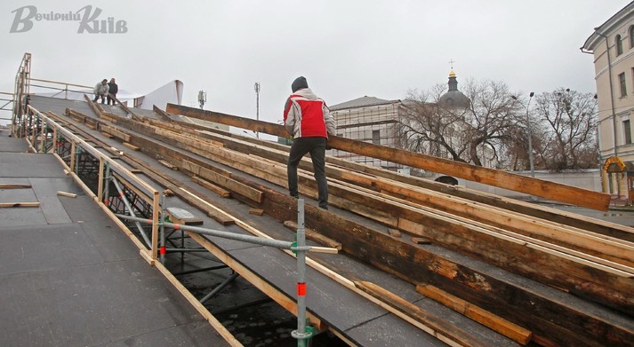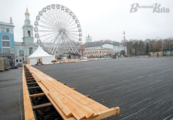 На Контрактовій площі монтують новорічне містечко з ялинкою, ковзанкою та льодовими гірками.