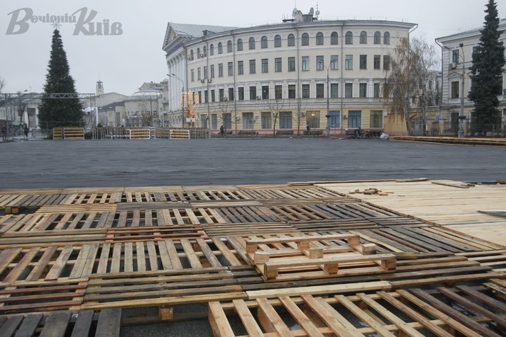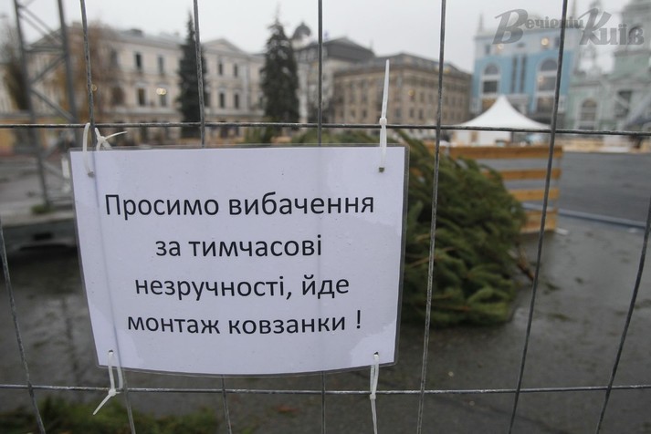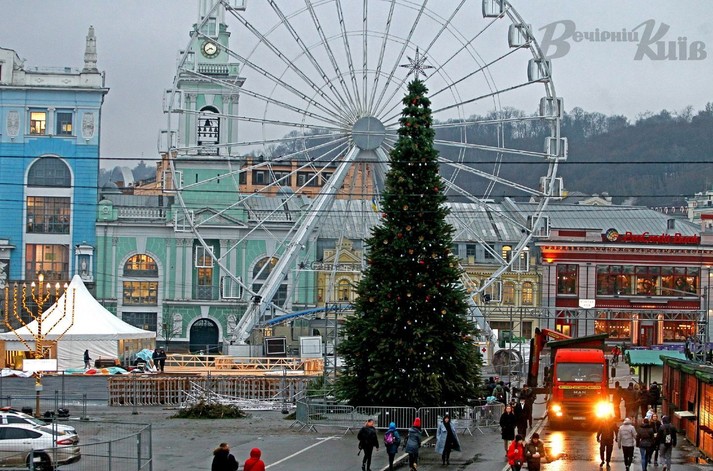 На площі вже встановили ялинку, прикрашену тарілками з петриківським розписом, яблуками та горішками. Зараз монтують ковзанку, а також гірки для дорослих та дітей, повідомляє «Вечірній Київ».