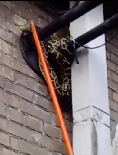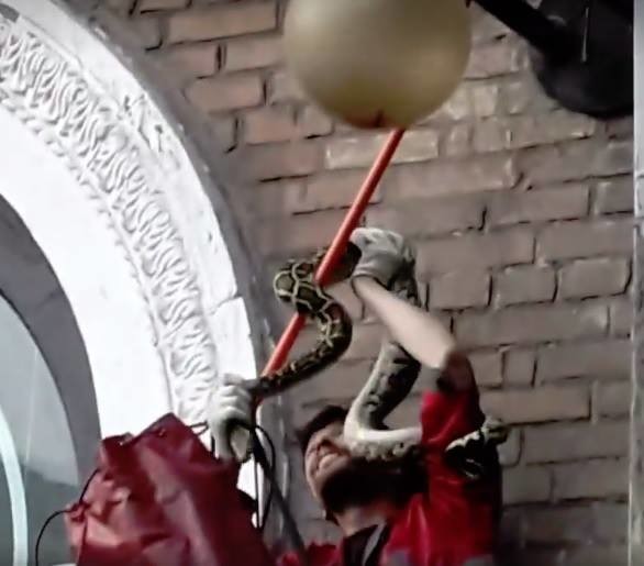 Рятувальник, що прибув на місце події, зняв тигрового пітона (довжиною близько 2 метрів) з ліхтаря за допомогою телескопічної палиці.